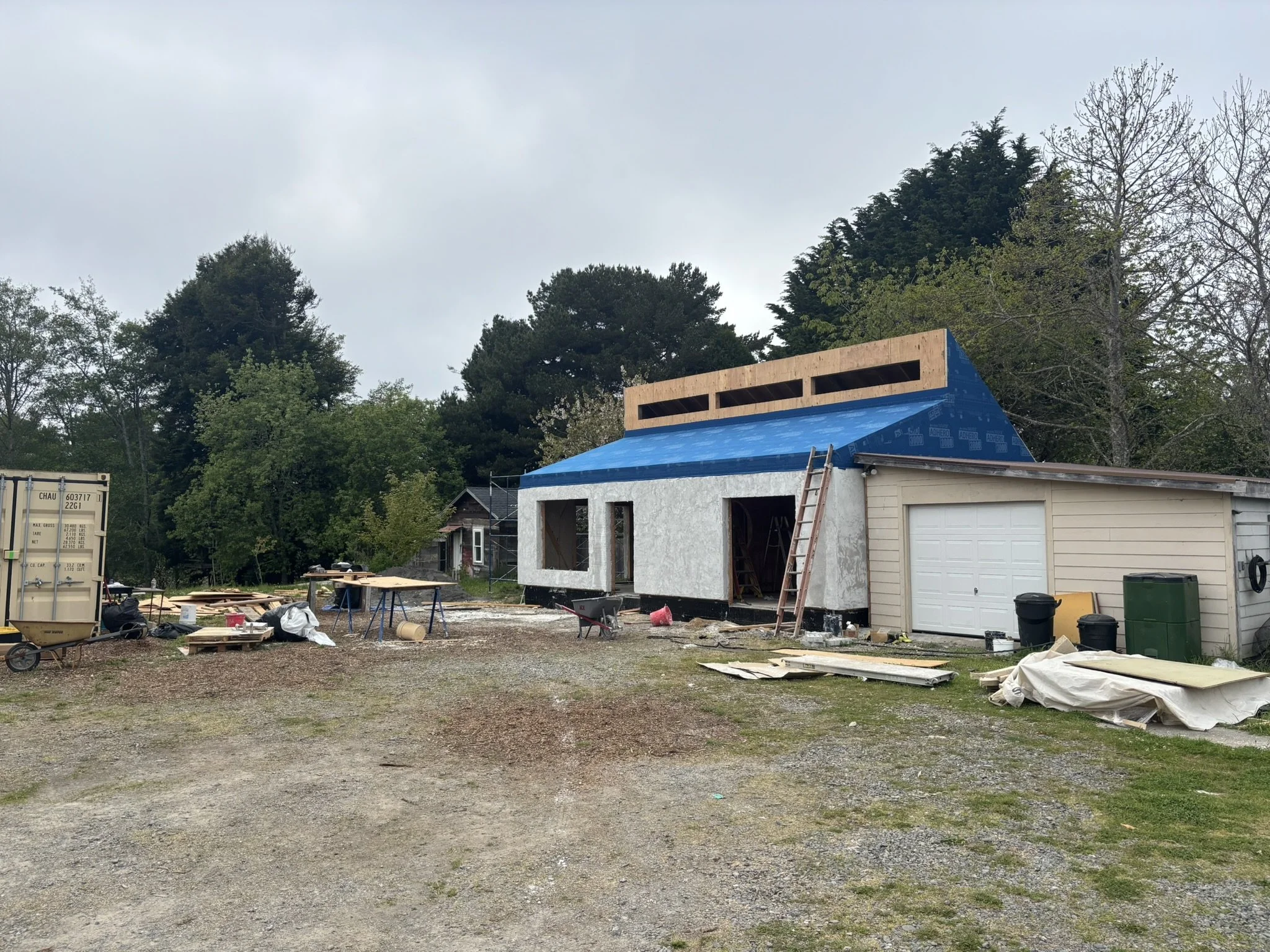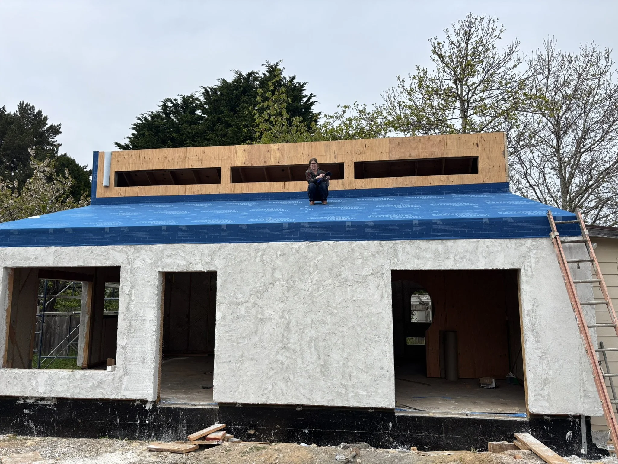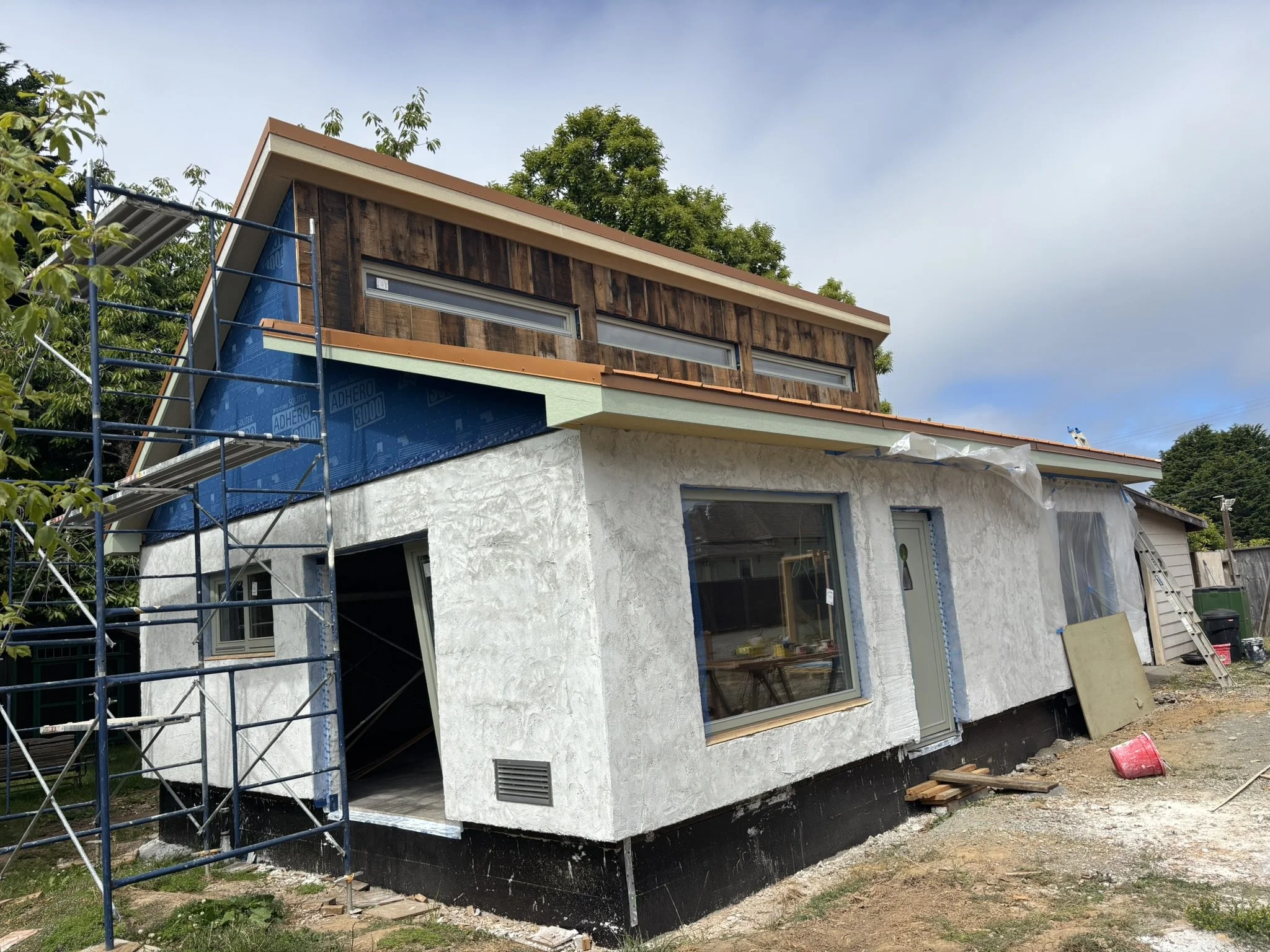 The roof assembly features a double-roof design with continuous exterior insulation, high-performance underlayment, and an airtight Adhero weather barrier wrapping the clerestory and roofline. Every seam was air-sealed for durability and energy efficiency, followed by furring strips and decking to create a ventilated roofing system.