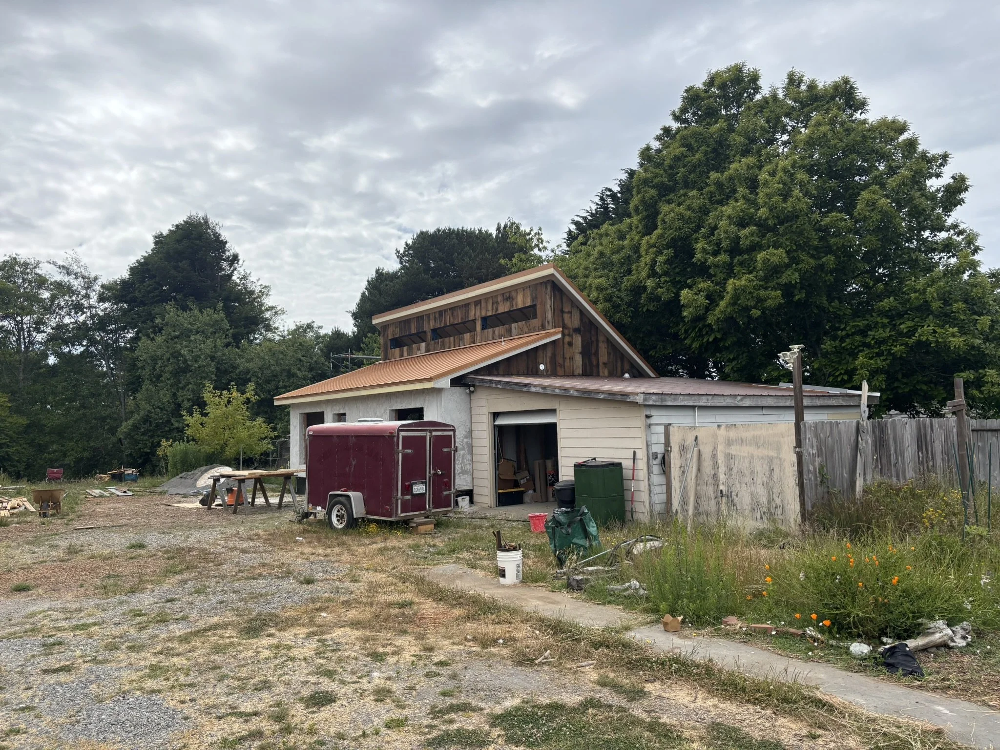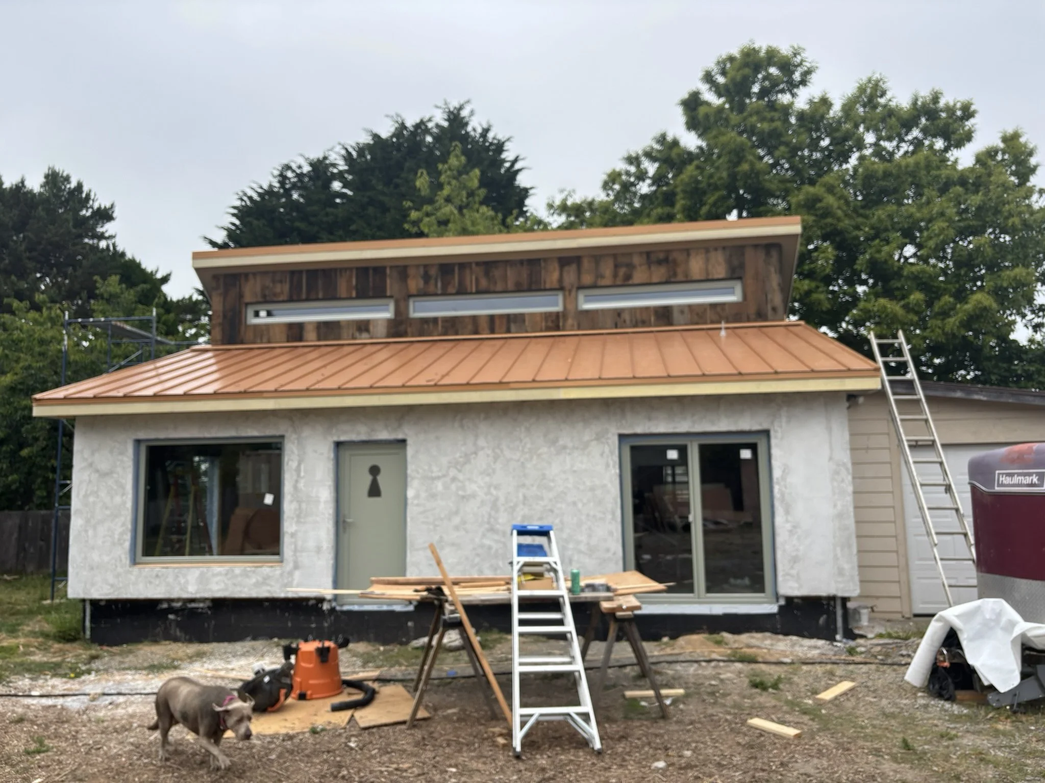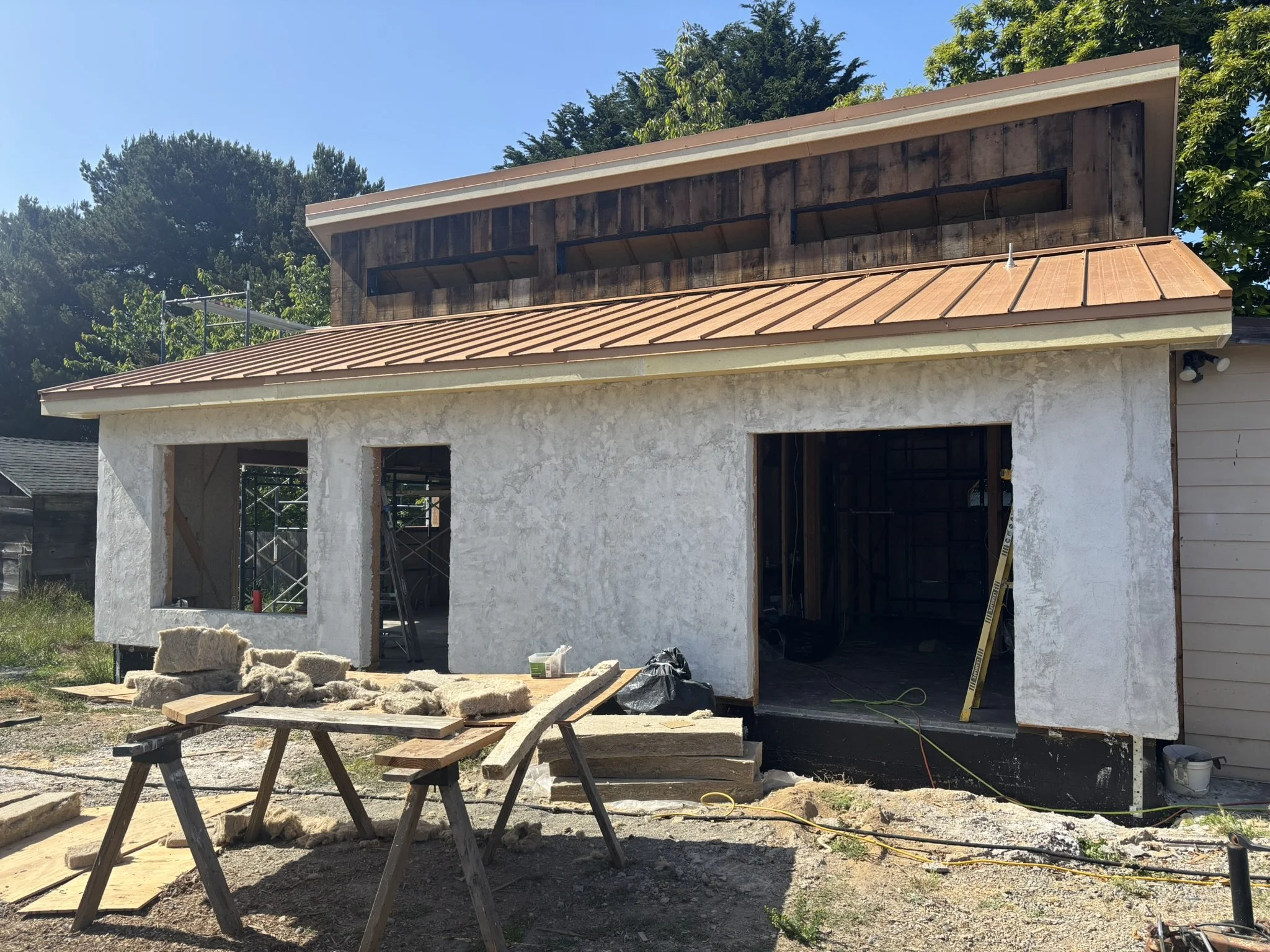 The roof assembly features a double-roof design with continuous exterior insulation, high-performance underlayment, and an airtight Adhero weather barrier wrapping the clerestory and roofline. Every seam was air-sealed for durability and energy efficiency, followed by furring strips and decking to create a ventilated roofing system.