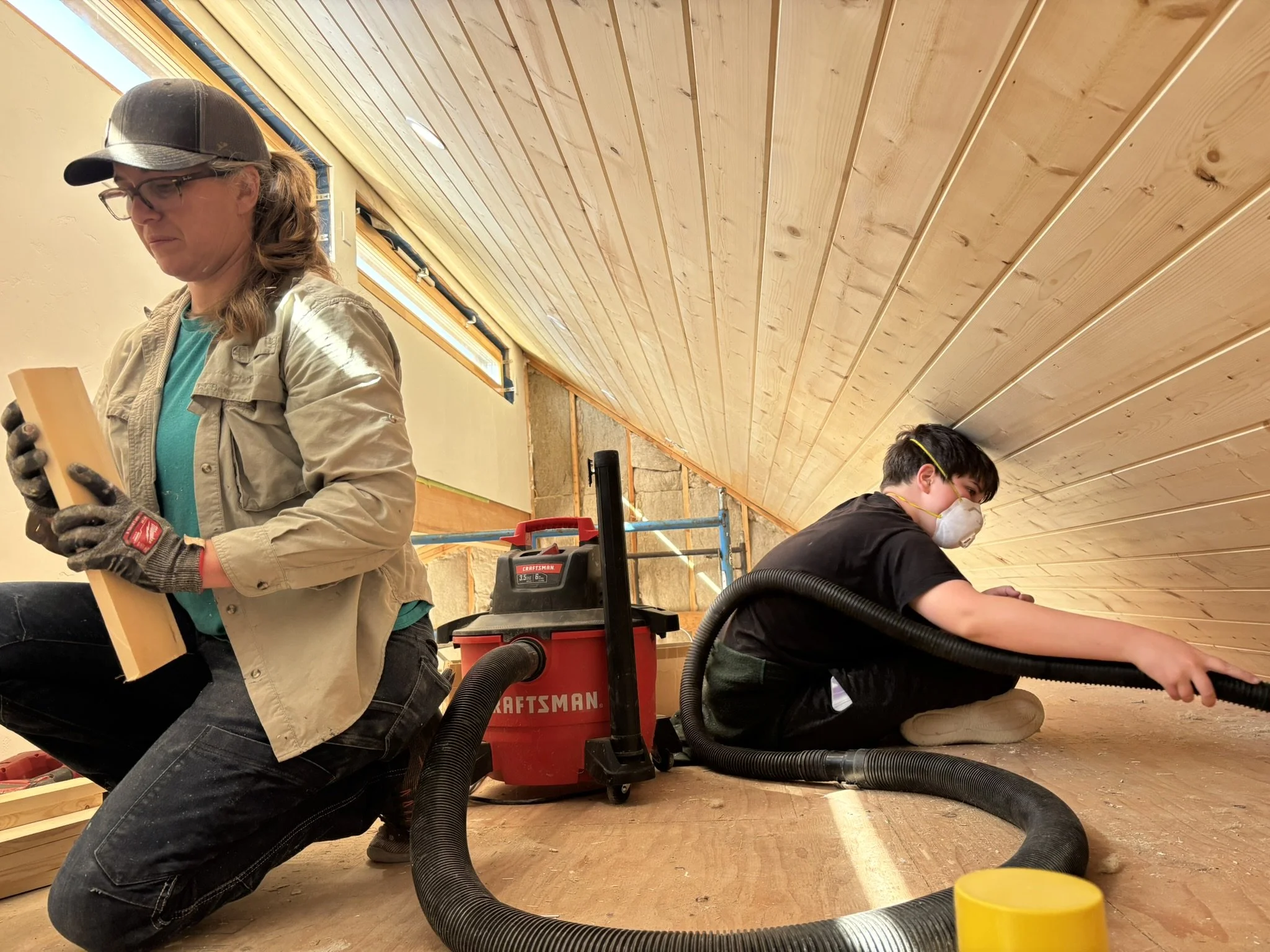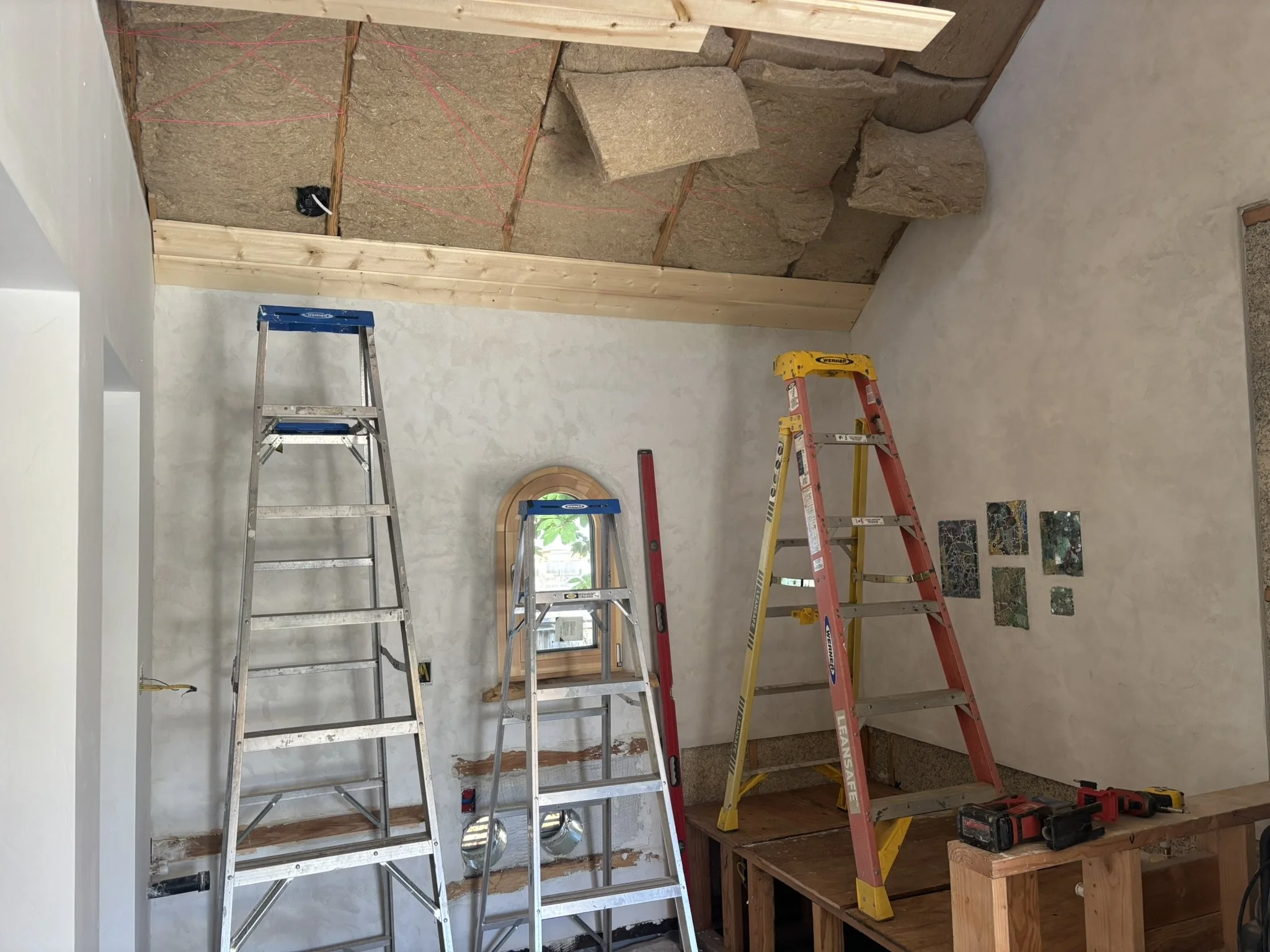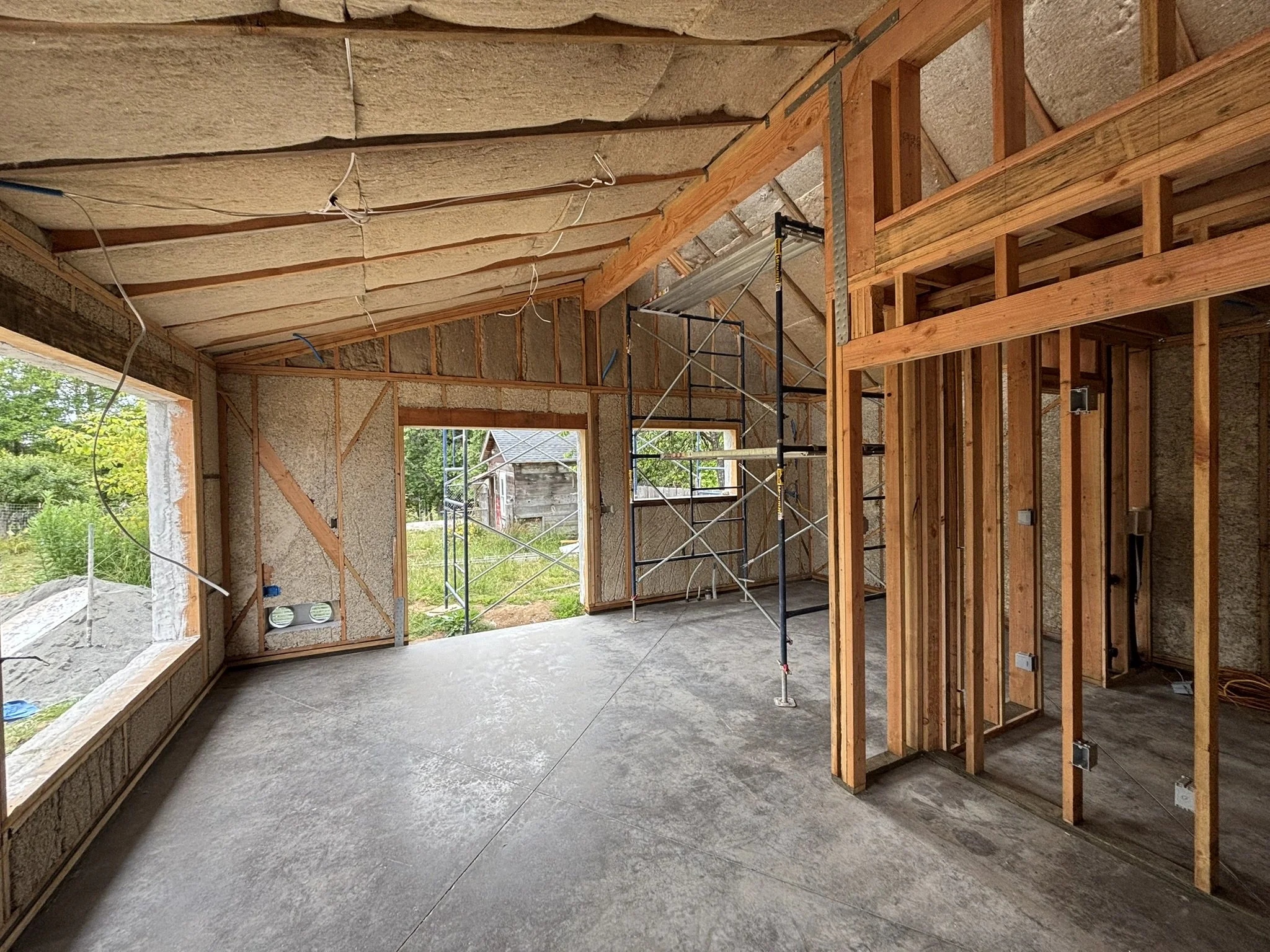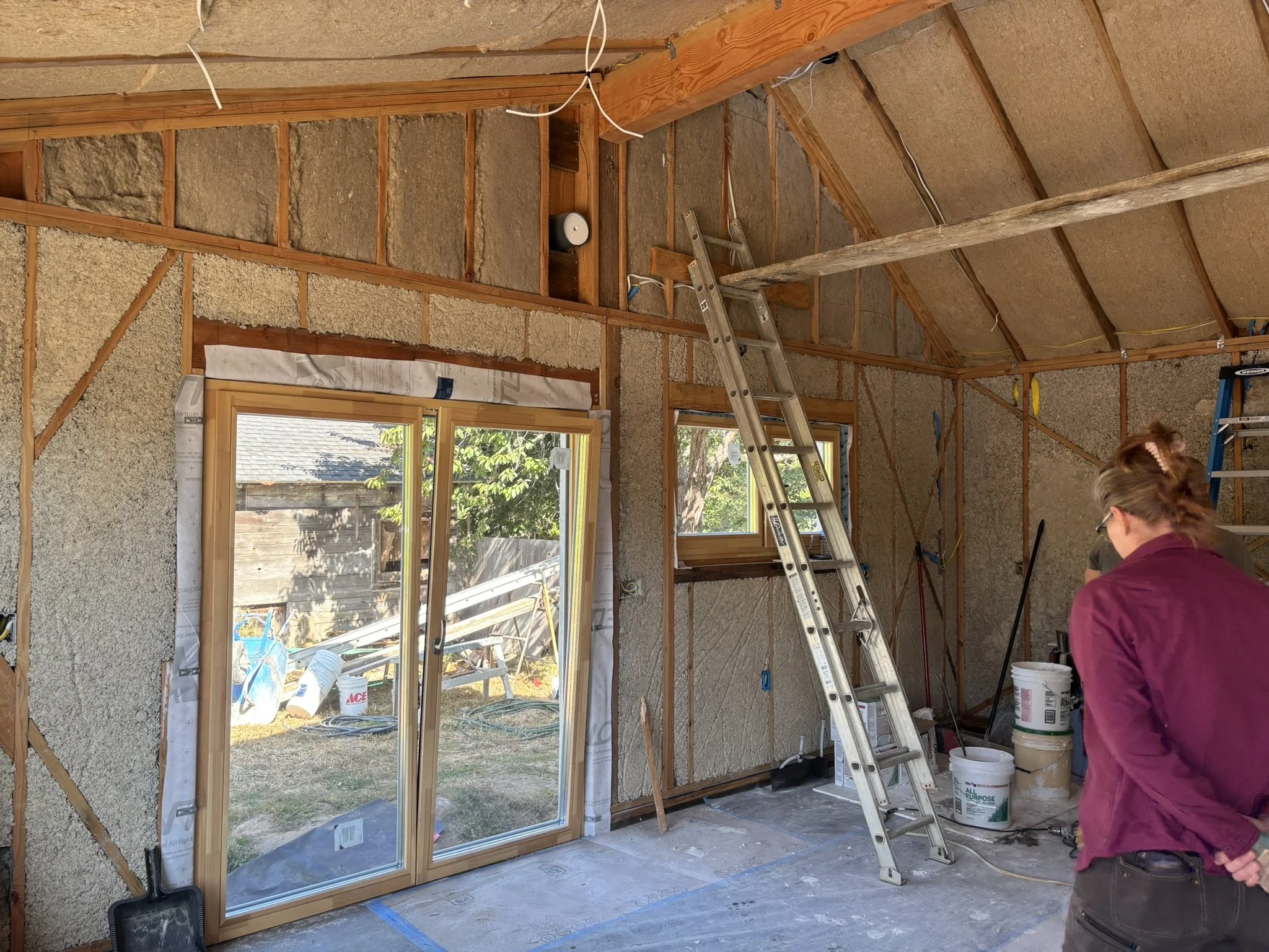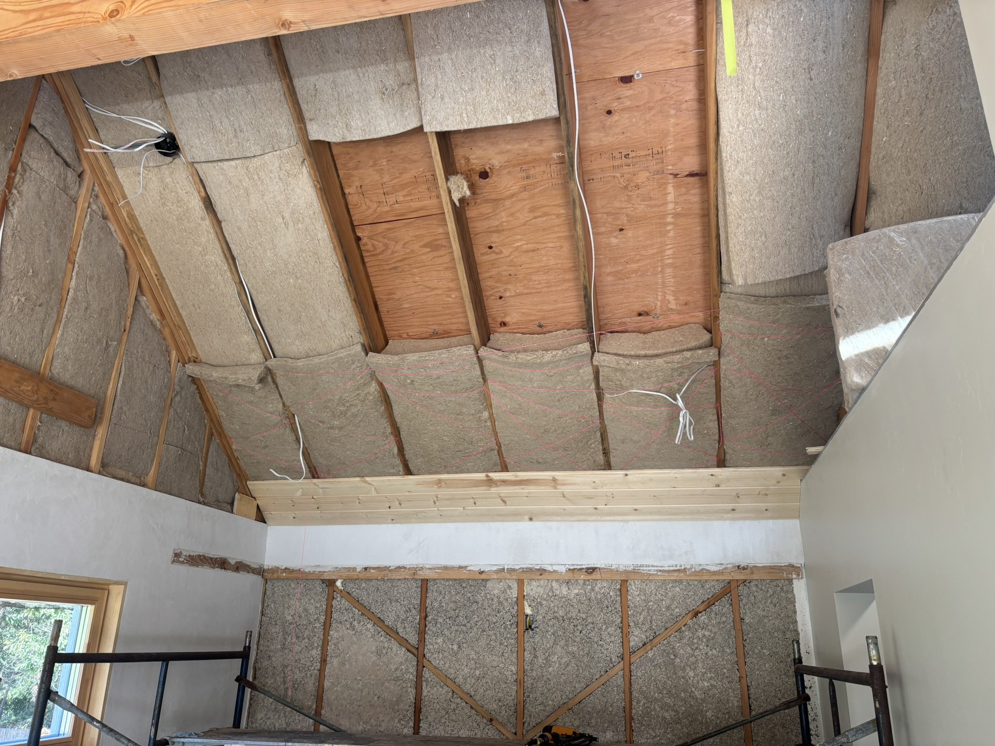 Inside, the vaulted ceilings were insulated with HempWool batts, maintaining the home’s commitment to renewable, vapor-open materials. Chrissy and Justin installed the tongue-and-groove pine ceiling, creating a warm, natural interior finish that complements the hempcrete walls.