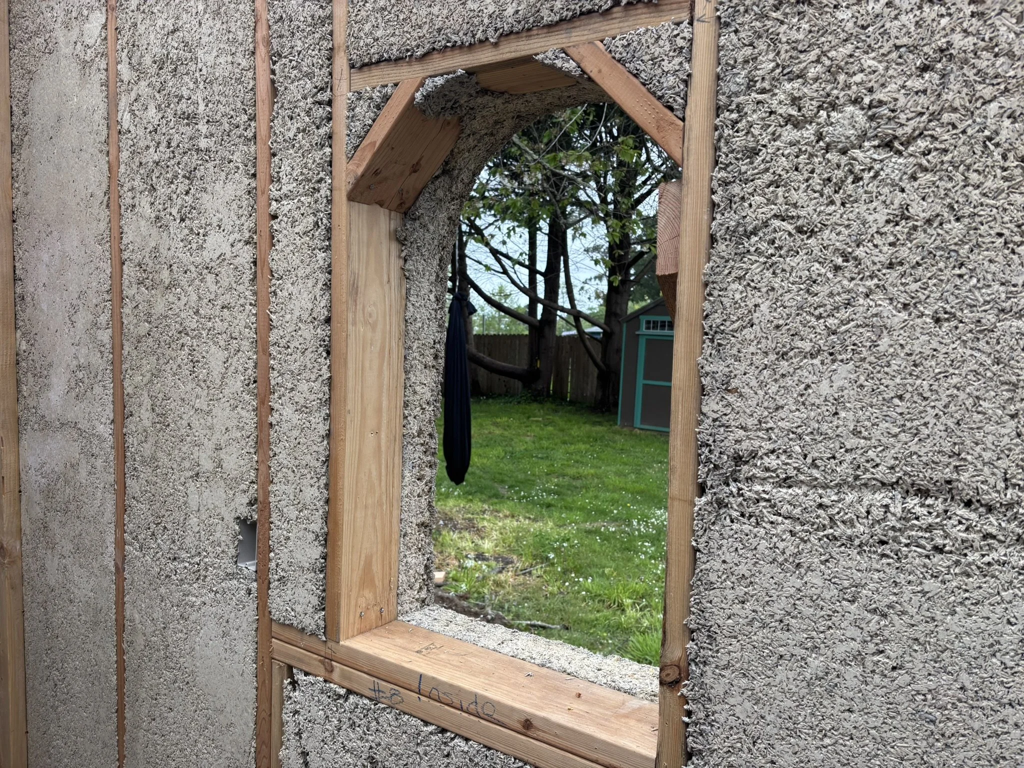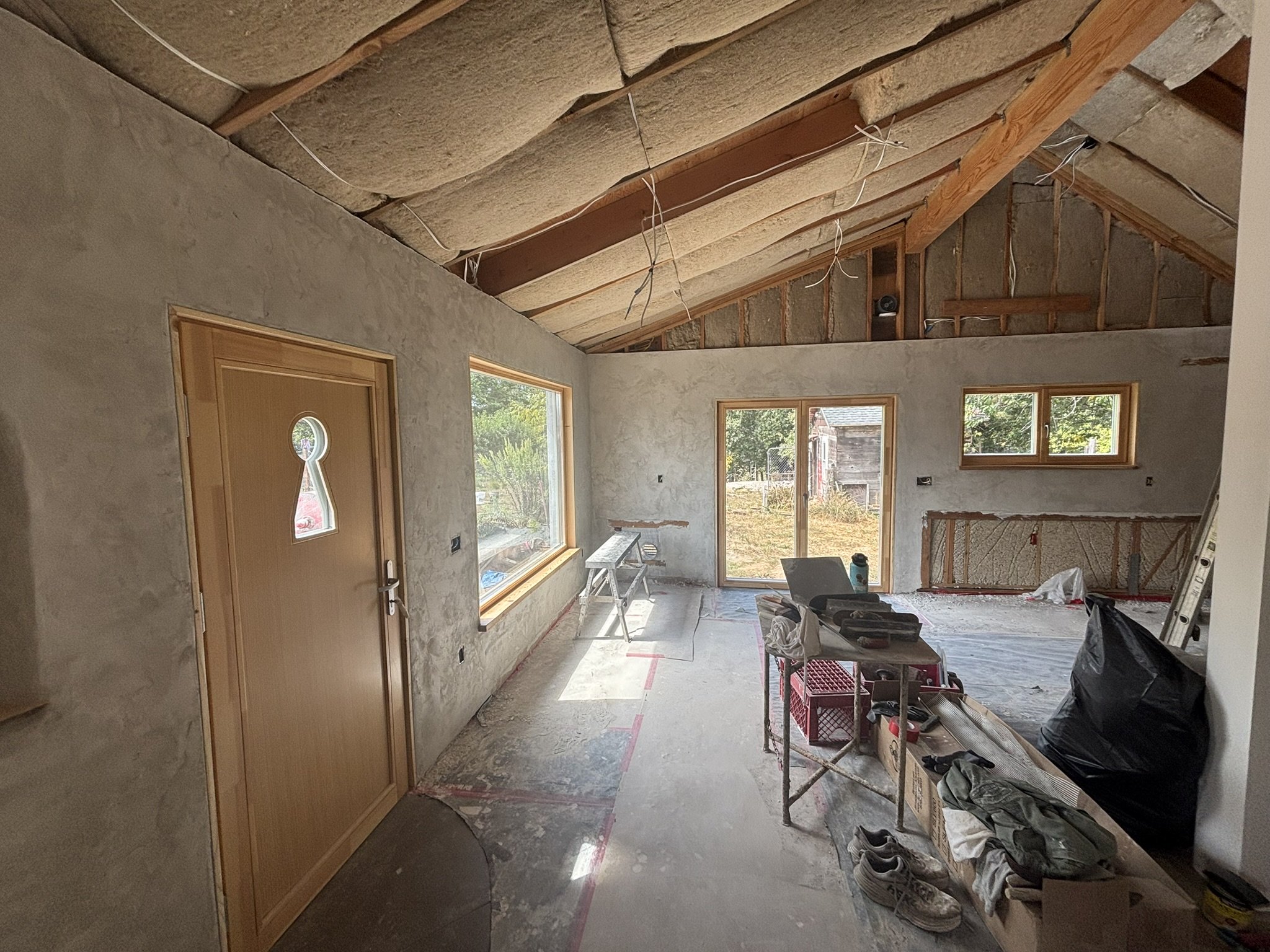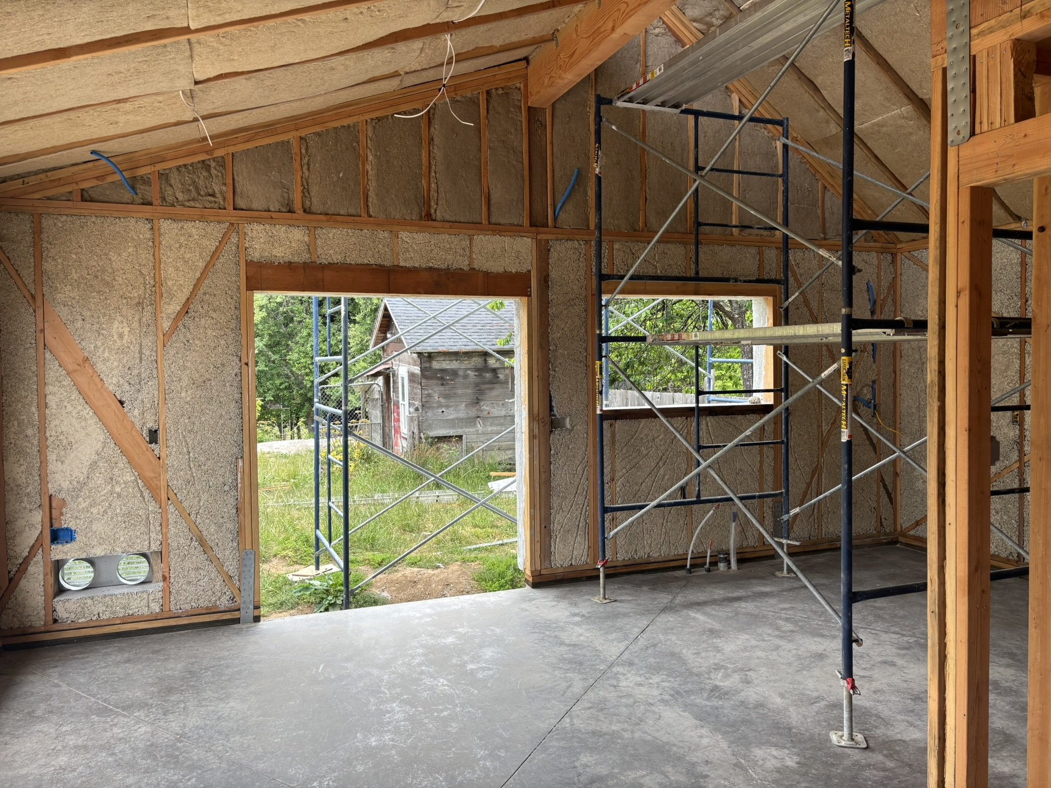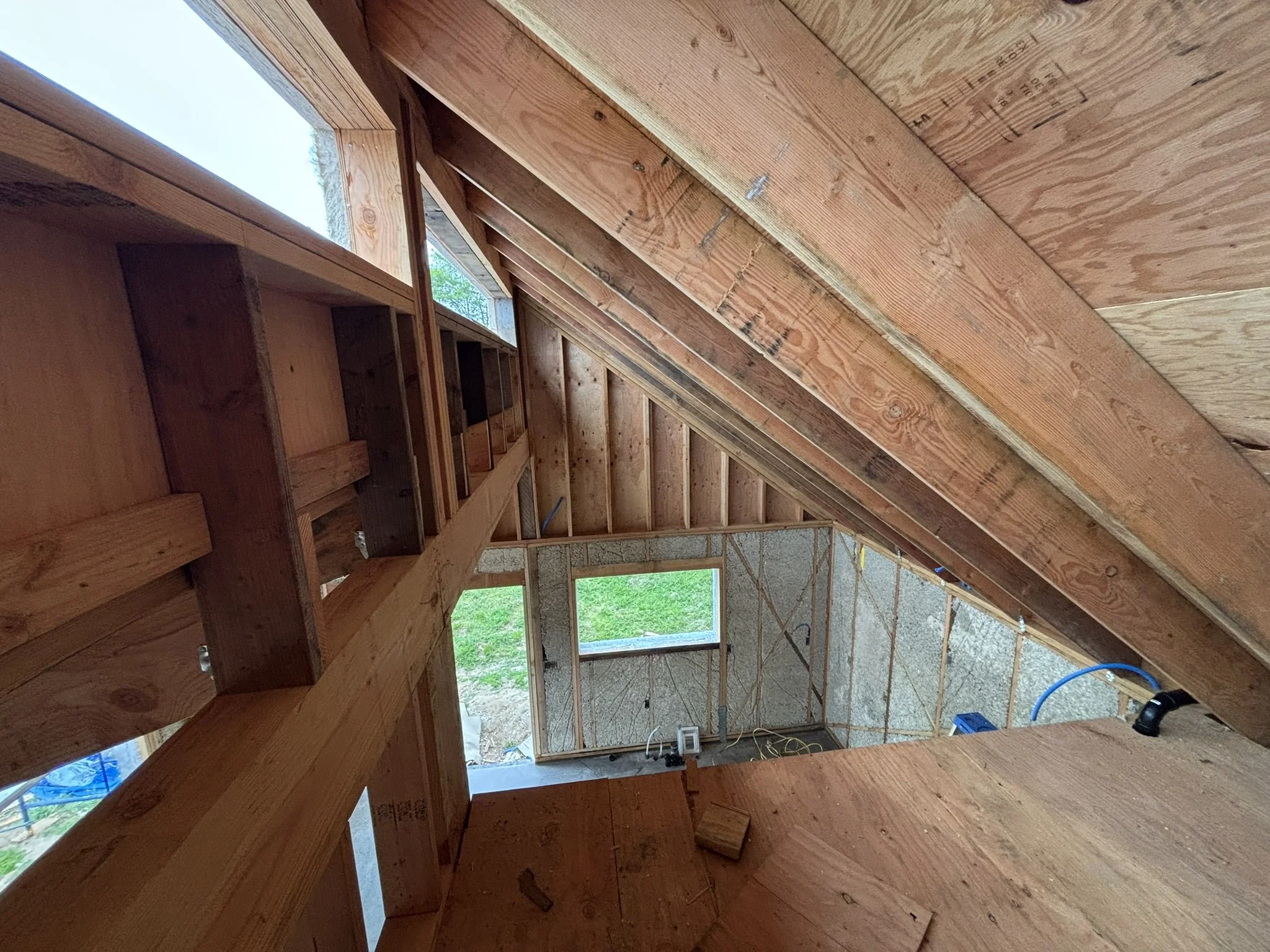 Inside, the vaulted ceilings were insulated with HempWool batts, maintaining the home’s commitment to renewable, vapor-open materials. Chrissy and Justin installed the tongue-and-groove pine ceiling, creating a warm, natural interior finish that complements the hempcrete walls.