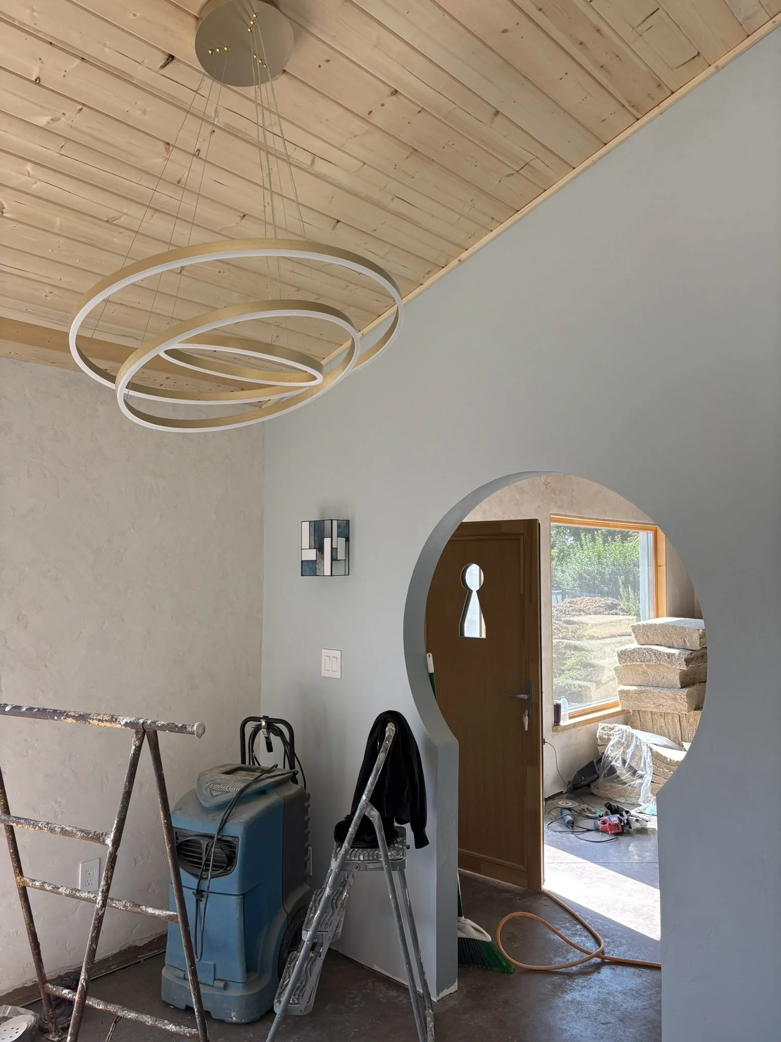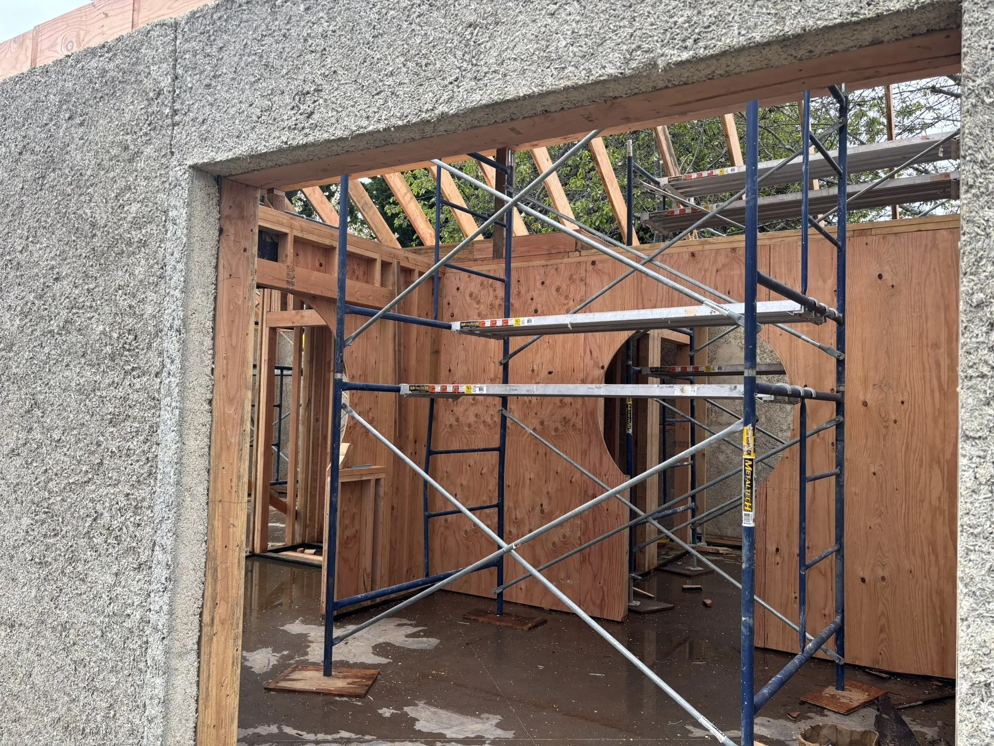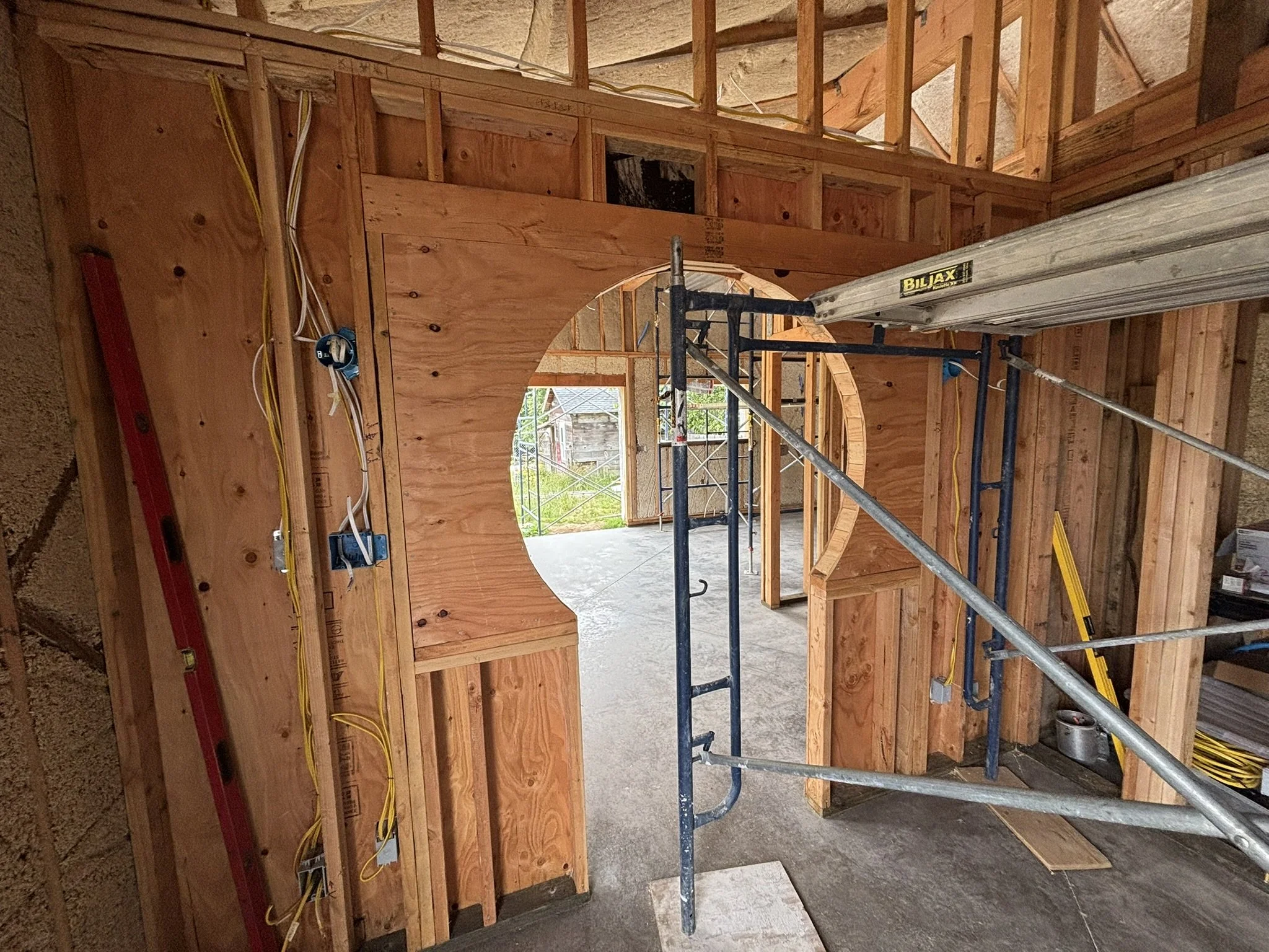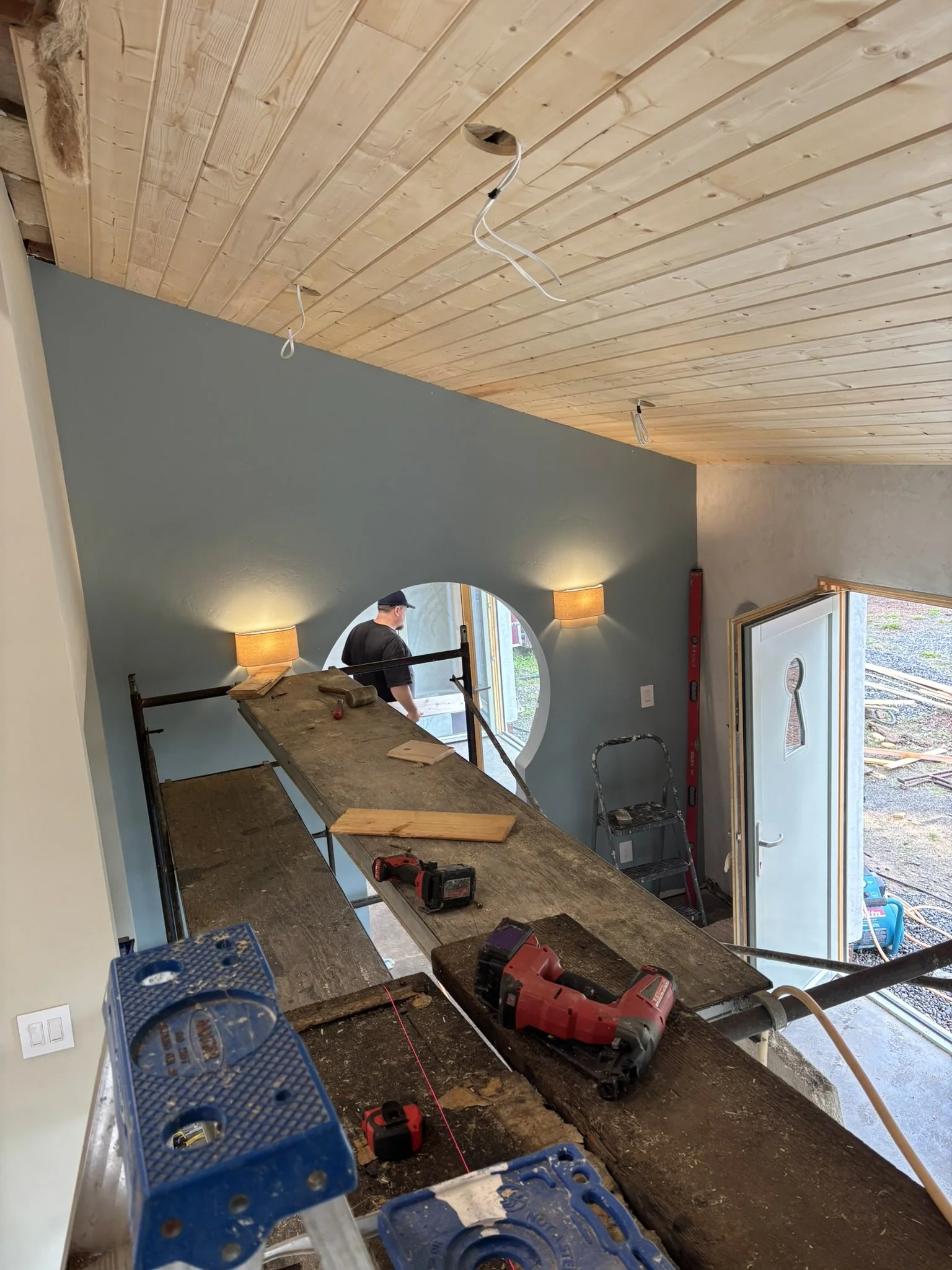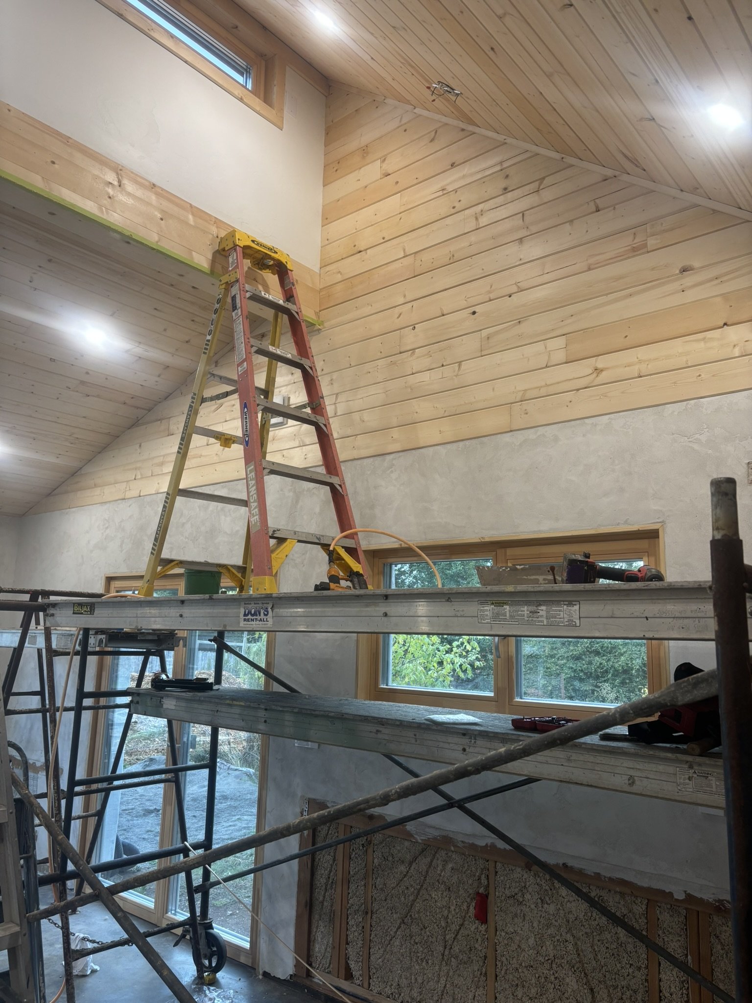Inside, the vaulted ceilings were insulated with HempWool batts, maintaining the home’s commitment to renewable, vapor-open materials. Chrissy and Justin installed the tongue-and-groove pine ceiling, creating a warm, natural interior finish that complements the hempcrete walls.