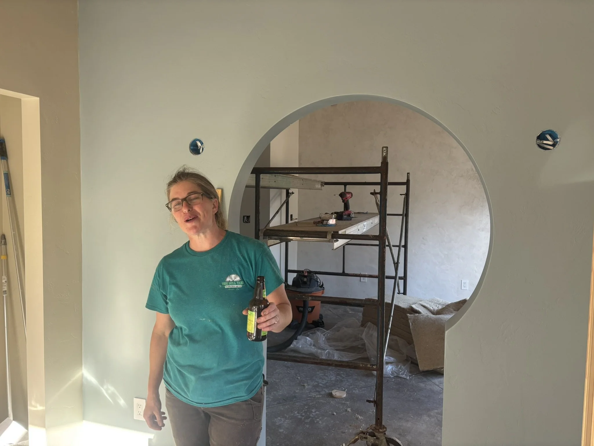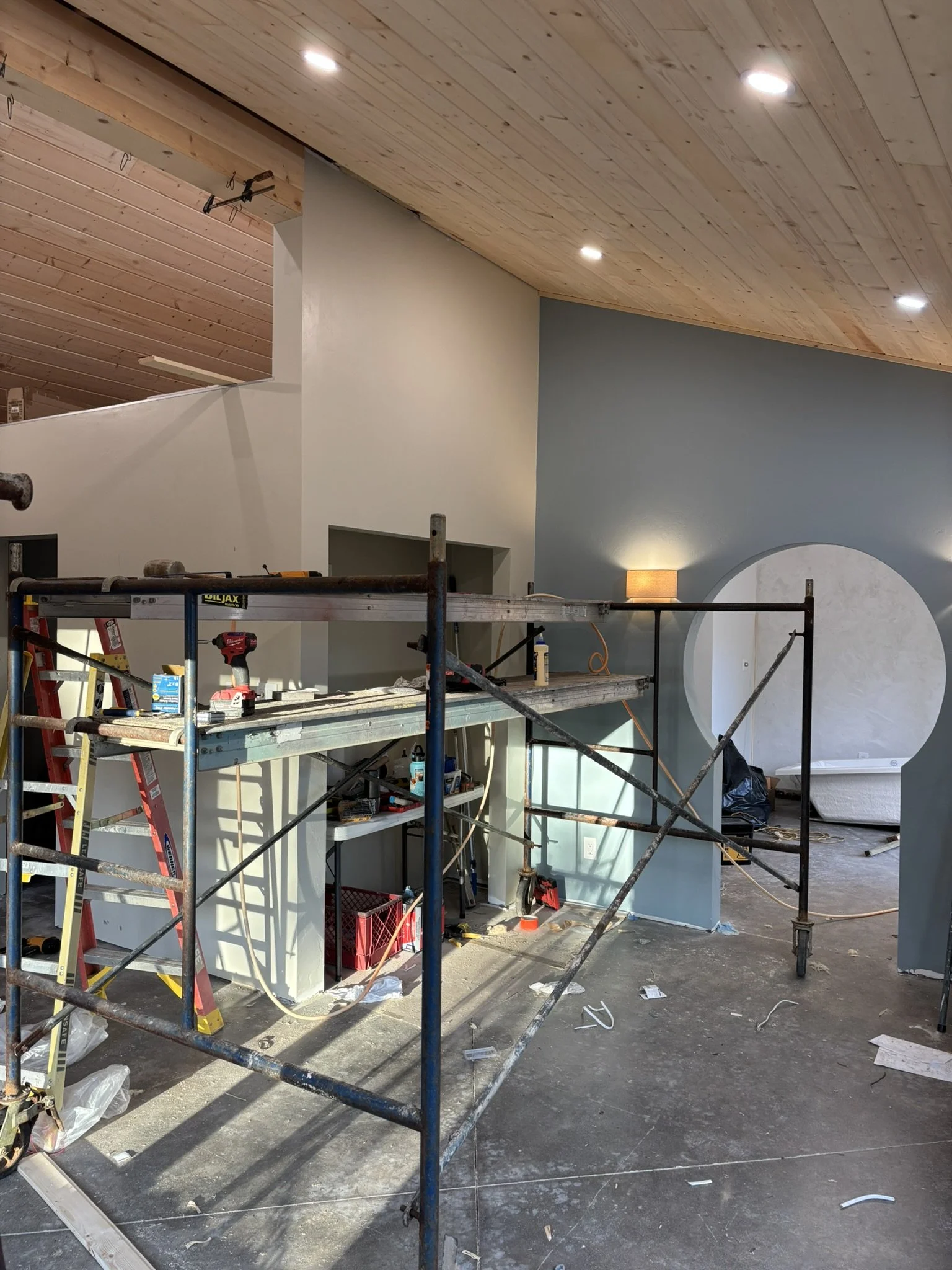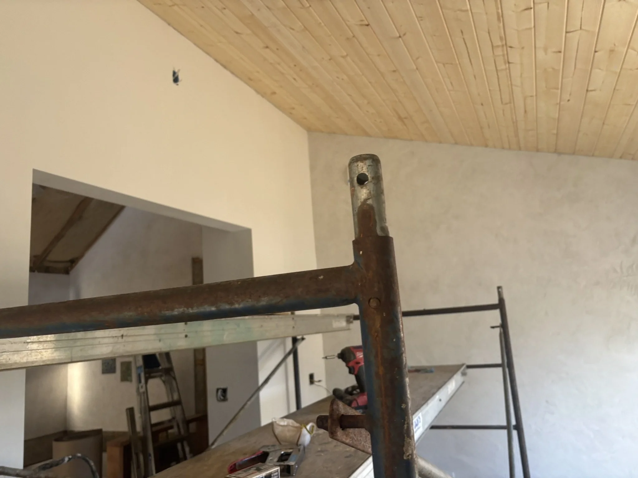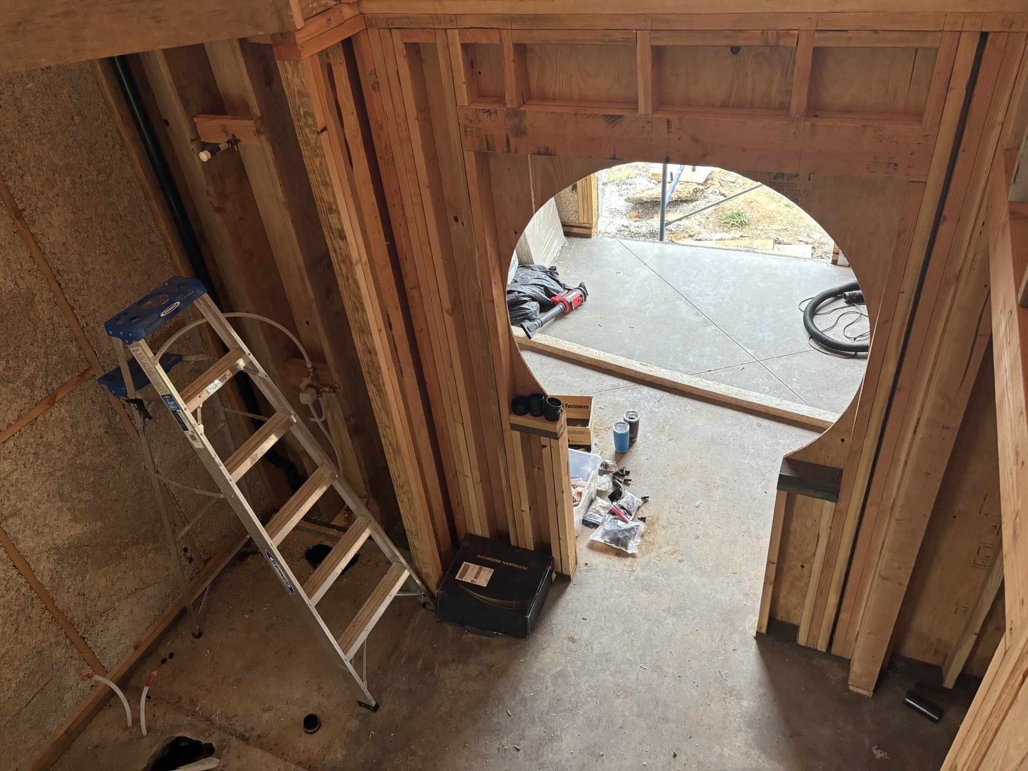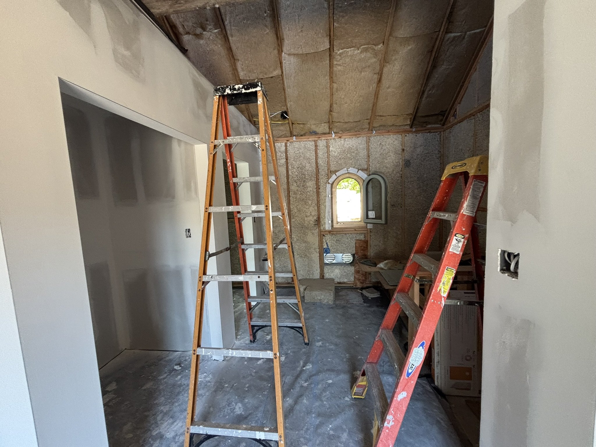 Inside, the vaulted ceilings were insulated with HempWool batts, maintaining the home’s commitment to renewable, vapor-open materials. Chrissy and Justin installed the tongue-and-groove pine ceiling, creating a warm, natural interior finish that complements the hempcrete walls.