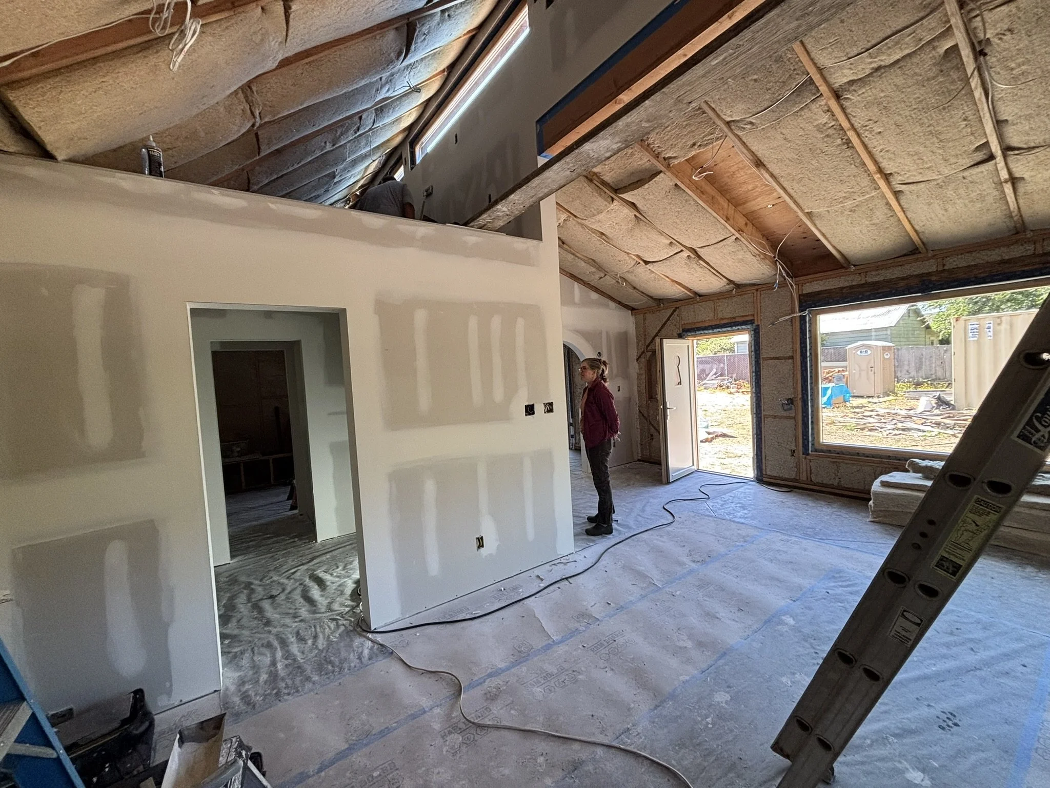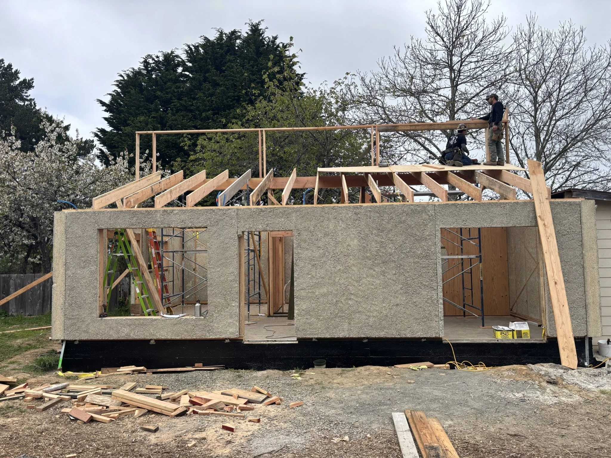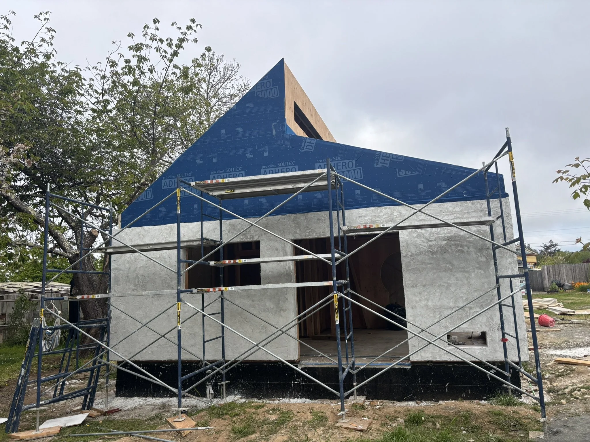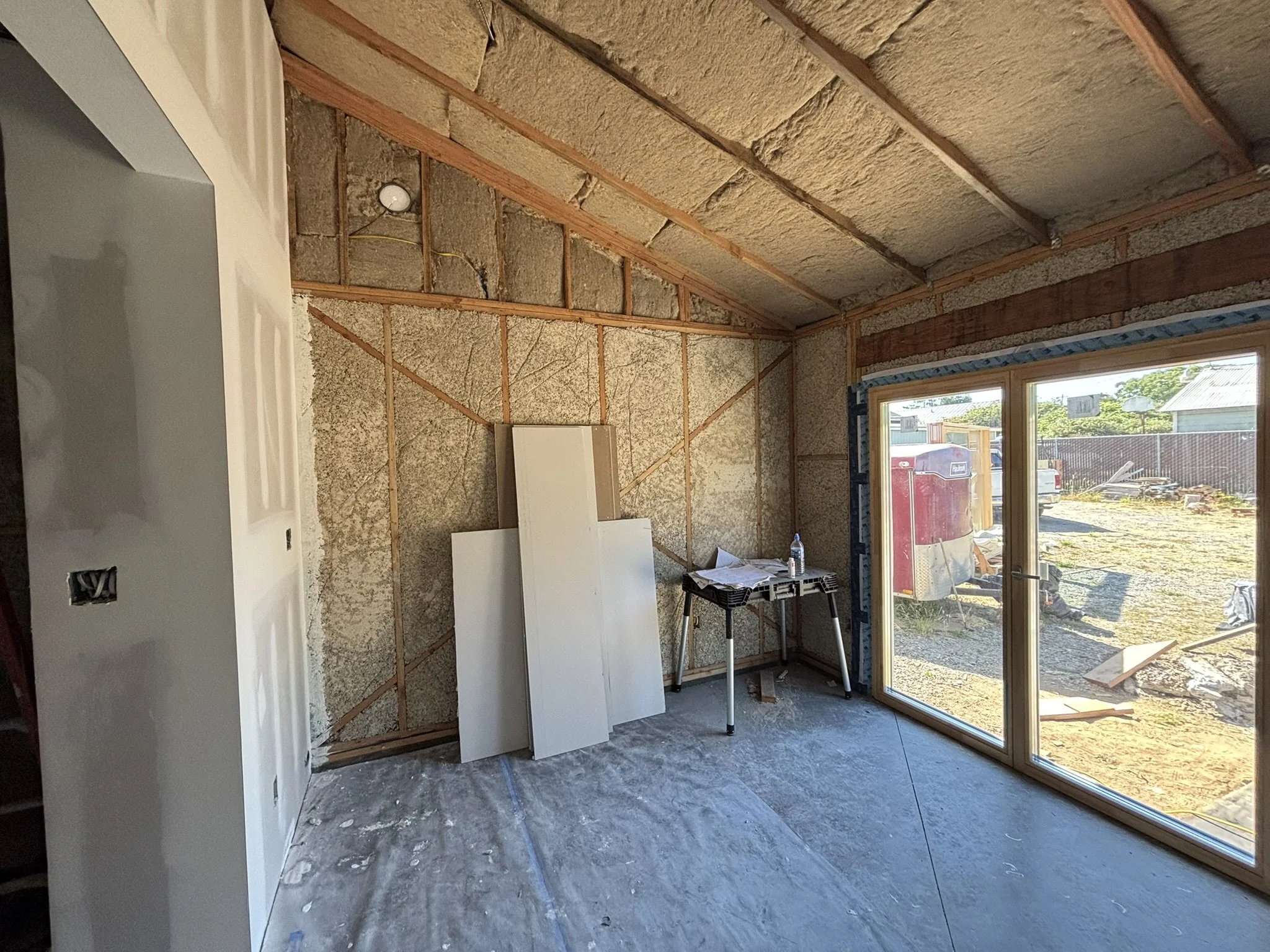 This phase captures the heart of the on-site craftsmanship: turning factory-built hempcrete walls into a truly high-performance, energy-efficient home. After tilt-up day, the project moved into detailed envelope work and advanced building-science construction techniques.