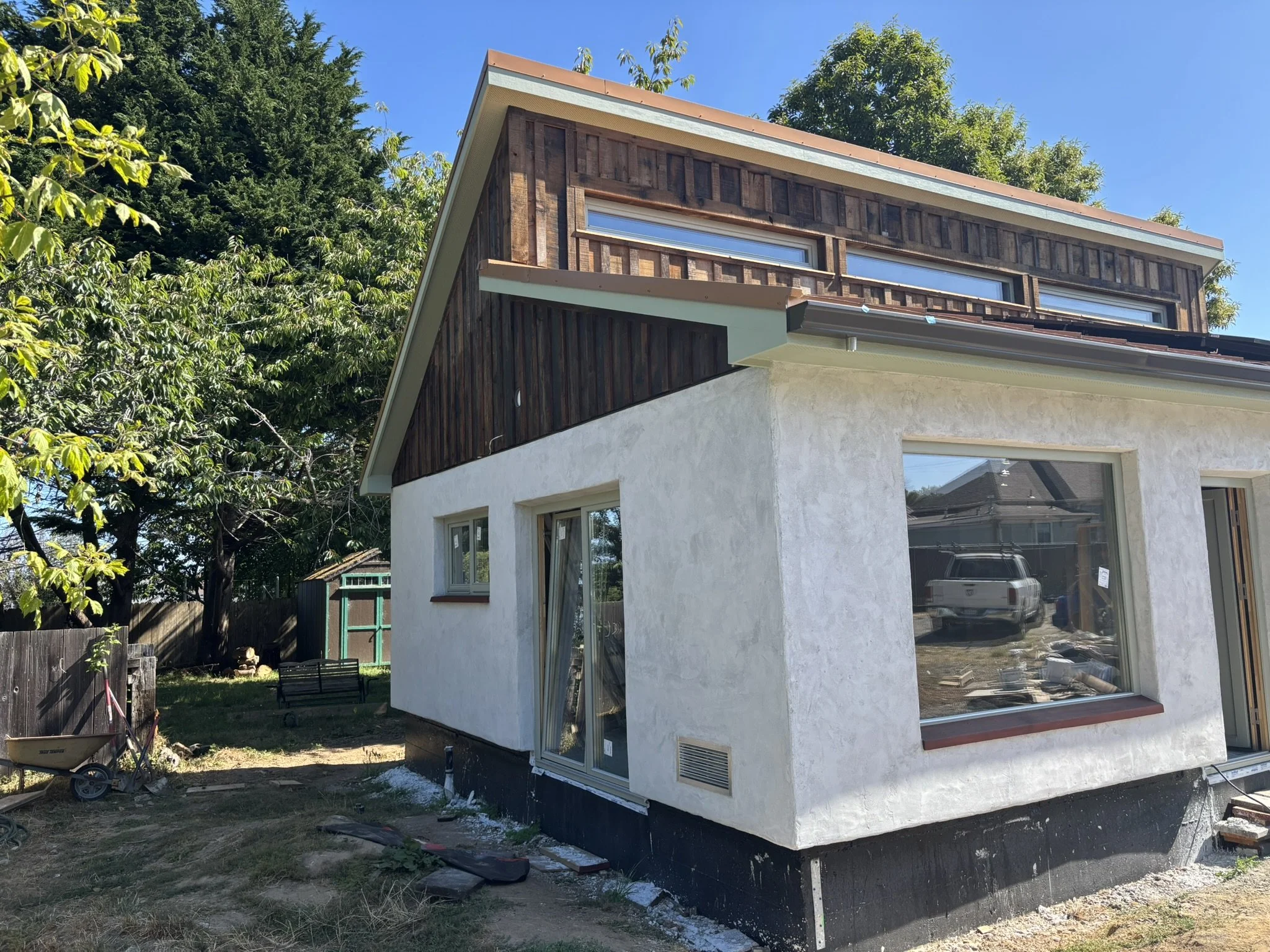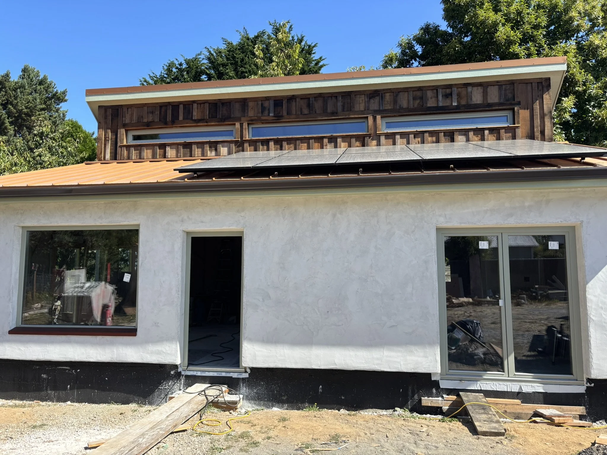 Triple-pane windows from Lithuania were installed for superior performance, while Chrissy and Justin completed the tongue-and-groove ceilings, tile work, trim, solar system, battery backup, and all-electric systems integration.