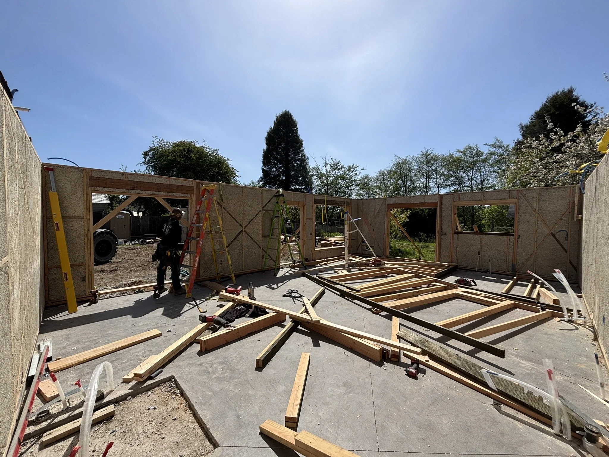 The walls were set, aligned, and secured to the slab; the roof framing and structural fastening followed.